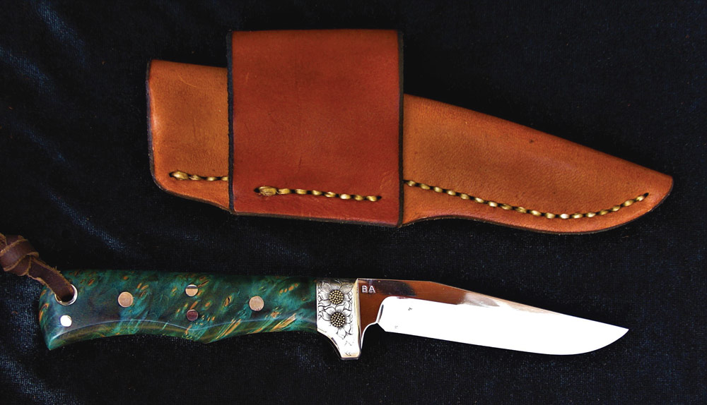Brian-Asher-Knife-and-Leather-Sheath-CPM-154-steel-blade-nickle-silver-bolster-and-pins-blue-Maple-burl-handle-7-inches-overall-1125-Bolsters-engraved-by-Troy-Menix-Sheath-by-Brian-Asher by Mo88_site | Aug 25, 2023